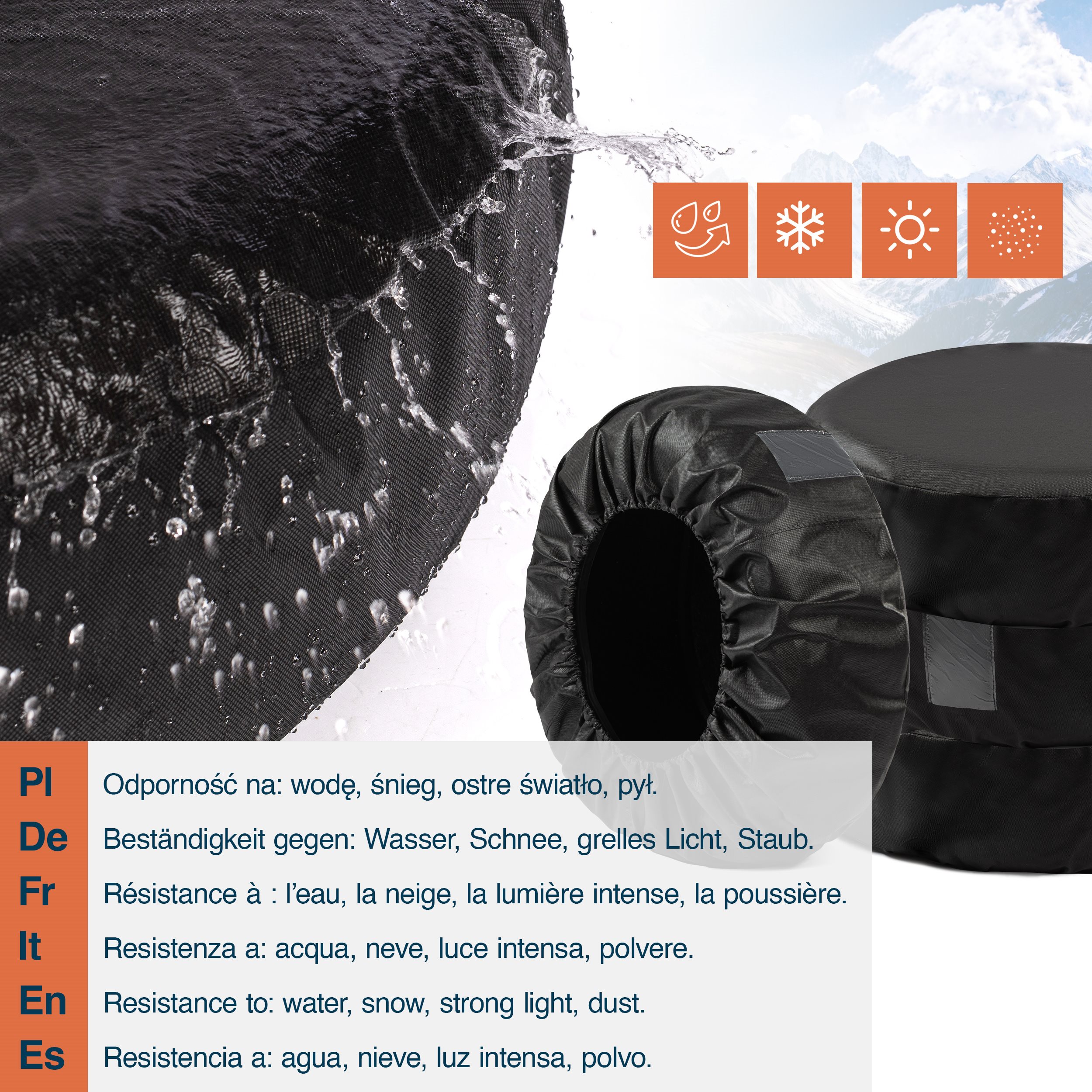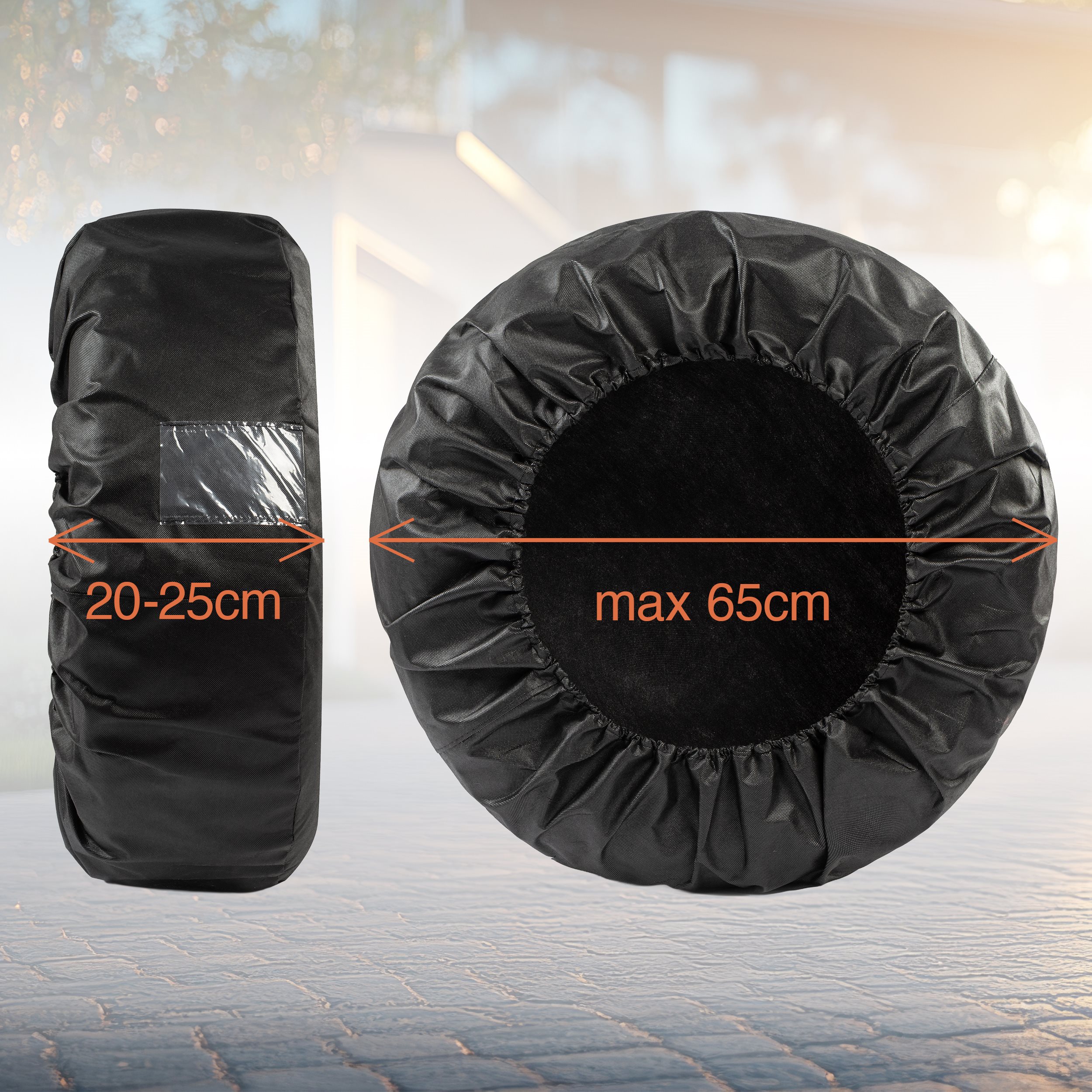 Pokrowiec ma schowane do wewnątrz wszystkie szwy przez co wygląda estetycznie. Dodatkowo posiada elastyczny ściągacz co zapewnia szybki montaż na kole oraz dodatkowe okienko do opisania rozmiaru koła.